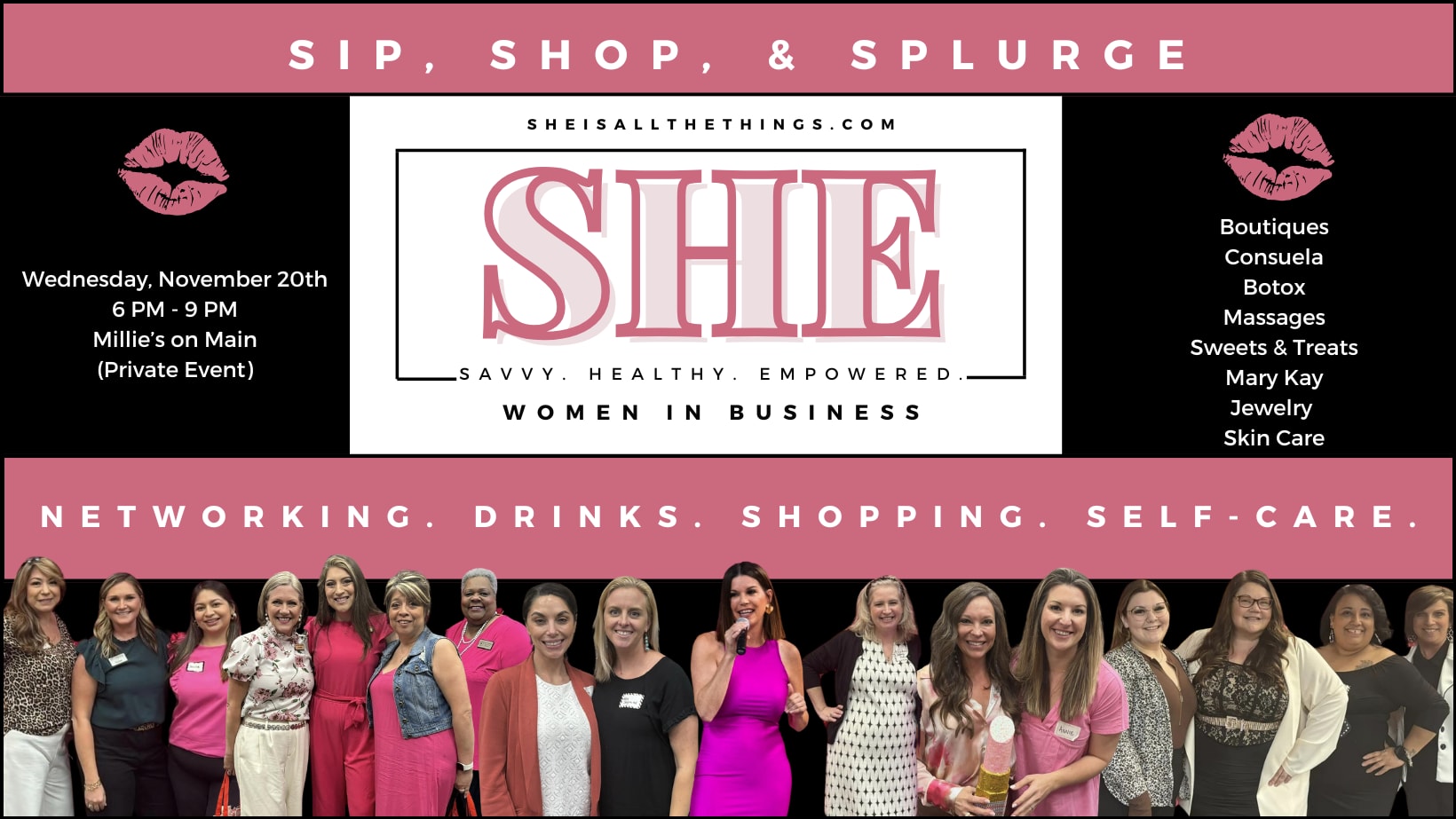 Get ready to unwind and unleash your inner diva! The holidays can be a whirlwind of chaos, but fear not, SHE knows the magic of self-care. That's why we're rolling out the red carpet for our fabulous Sip & Splurge extravaganza, back by popular demand! Gather with a powerhouse squad of ladies for an evening of pure indulgence and pampering. Treat yourself to tasty treats, clink glasses of wine, and make self-care the star of the show!