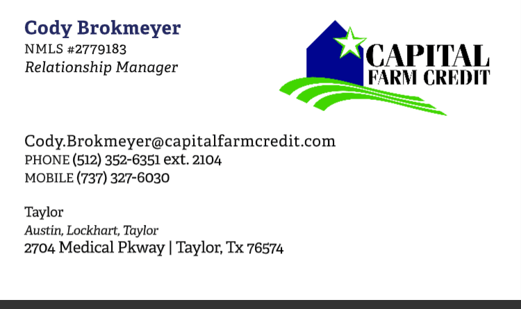 I serve as a Relationship Manager with Capital Farm Credit in Taylor, Texas, where I support agribusinesses and community members across Williamson, Lee, and surrounding counties. In this role, I focus on strengthening relationships with customers by providing knowledgeable, reliable financial guidance and capital with personalized service tailored to their operations and needs.