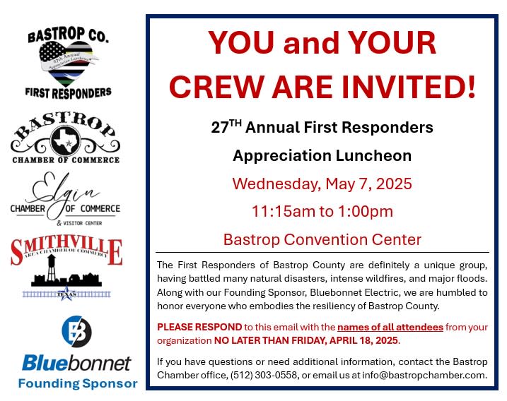 On May 7, the Elgin, Bastrop and Smithville Chambers will proudly honor our first responders from across Bastrop County for the 27th year. We will provide a complimentary lunch and a small token of appreciation to about 125-180 first responders. Join us!