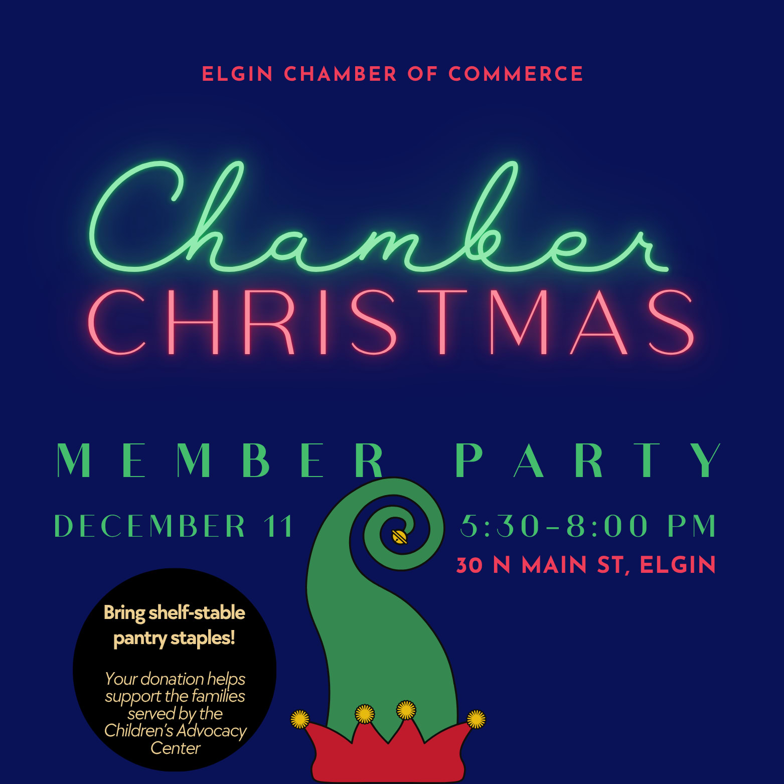 Join us for the 2025 Elgin Chamber Member Christmas Party! We’re celebrating the season with complimentary food, drinks, and great company as a thank-you to our amazing members. Open to Elgin Chamber members only. This free event is our favorite way to wrap up the year, we just ask you register so that we can get a head count. We hope to see you there! We would love you to consider bringing shelf-stable pantry staples to help local families facing food insecurity. Items like ready-to-make meals, canned meats, shelf stable sides, kid-friendly snacks, cereals, peanut butter & jelly, and boxed or bottled drinks are greatly appreciated. All donations will support families served by the Children’s Advocacy Center. Let’s celebrate and give back together! ❤️