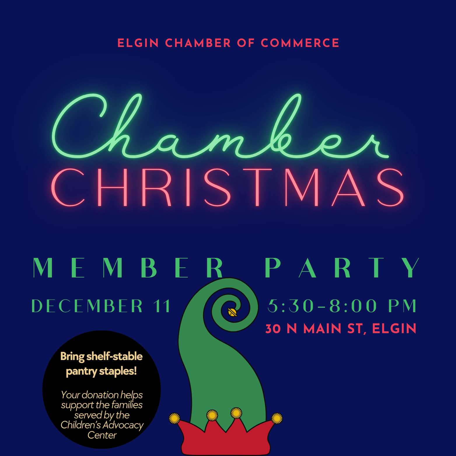 Join us for the 2025 Elgin Chamber Christmas Party! We’re celebrating the season with complimentary food, drinks, and great company as a thank-you to our amazing members. This free event is our favorite way to wrap up the year, we just ask you register so that we can get a head count. We hope to see you there! We would love you to consider bringing shelf-stable pantry staples to help local families facing food insecurity. Items like ready-to-make meals, canned meats, shelf stable sides, kid-friendly snacks, cereals, peanut butter & jelly, and boxed or bottled drinks are greatly appreciated. All donations will support families served by the Children’s Advocacy Center. Let’s celebrate and give back together! ❤️