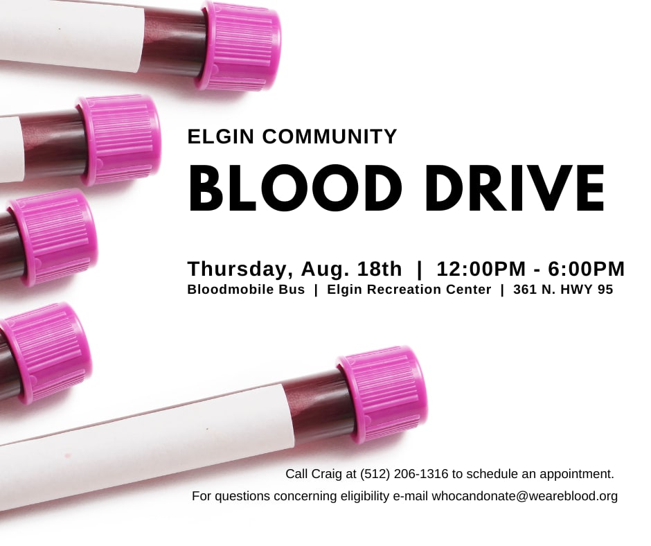 The Bloodmobile Bus will be at the Elgin Recreation Center, 361 N. HWY 95 from 12:00PM - 6:00PM on Thursday, August 18th.