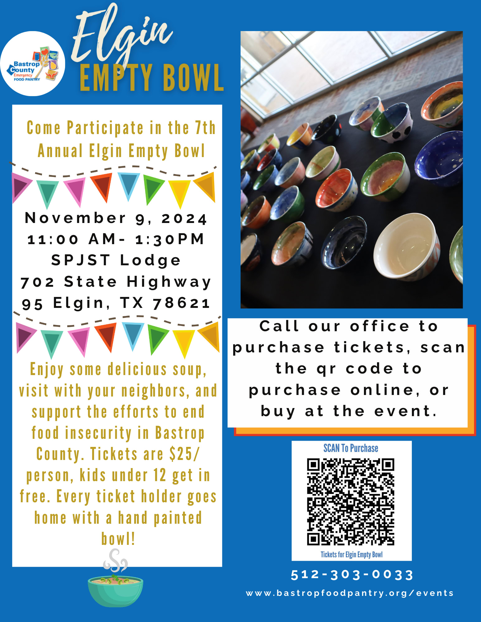 Enjoy some delicious soup, visit with your neighbors, and support the efforts to end food insecurity in Bastrop County. Tickets are $25/ person, kids under 12 get in free. Every ticket holder goes home with a hand painted bowl!