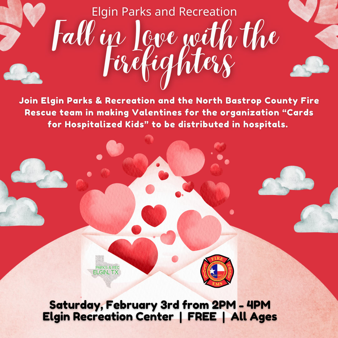 Elgin Parks & Recreation and the North Bastrop County Fire Rescue team will be in the Lobby of the Elgin Recreation Center Saturday, February 3rd from 2PM - 4PM to create Valentines for the organization "Cards for Hospitalized Kids"! You'll also be able to make Valentines for your friends and family with our custom crafts bar!