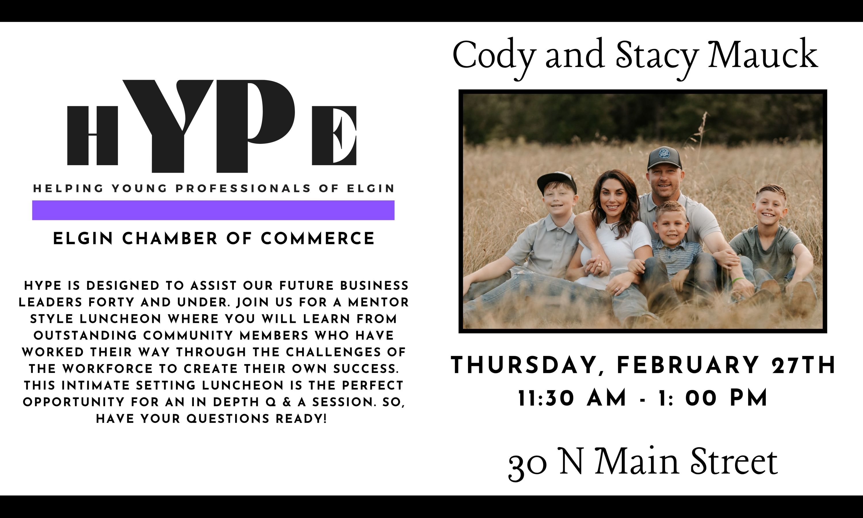 We invite you to attend our first HYPE Mentor Luncheon featuring Cody and Stacy Mauck, owners of Millie's On Main, on Thursday, February 27th, from 11:30 AM to 1:00 PM.