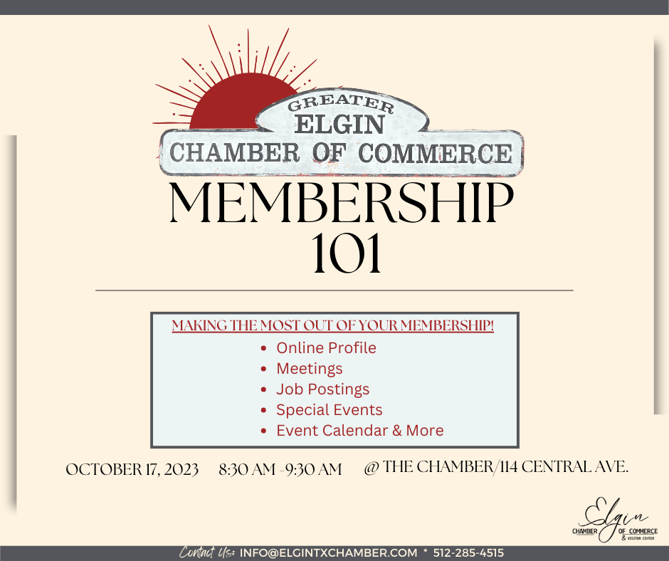 As a member of the Elgin Chamber of Commerce, you have access to a variety of resources, opportunities, and benefits. However, we understand that navigating through everything can be a difficult challenge. That's why we developed Membership 101! The Chamber team will discuss the best ways for your company to get involved with the Chamber and introduce tools that can help match your company's interests and needs with the Chamber's extensive programs and activities.