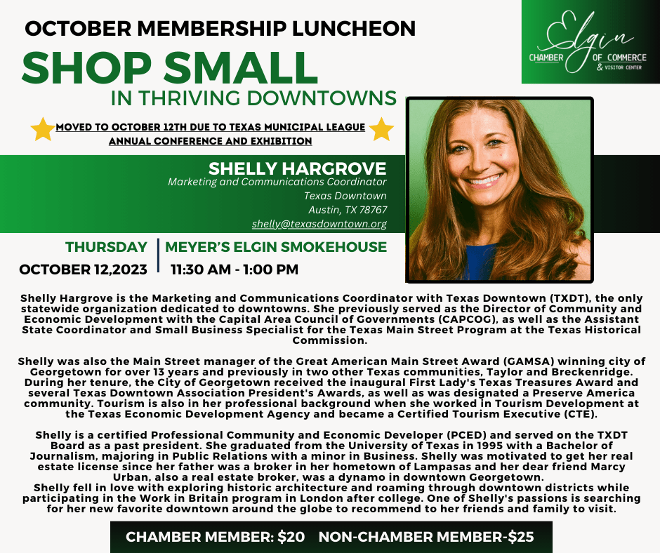 Join us on October 12th at 11:30 a.m. at Meyer's Elgin Smokehouse for the October Membership Luncheon. Shelly Hargrove, Vice President of Texas Downtown, will speak in place of our regular meeting. She will be presenting on Shop Small in Thriving Downtowns, and you will not want to miss it!