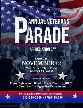 Join us downtown this weekend for the annual Veterans' Parade. Saturday, November 12, 2022, beginning at 10 a.m., on Main Street, in Elgin, TX. Sponsored by VFW Post 6115 Elgin. The parade route starts at Main and 11th street and travels south through downtown along Main Street. This year’s parade features the Elgin Wildcat High School Band, Elgin Wildcat Cheer Team, JR ROTC, Camp Swift and the Elgin Fire Department among others.