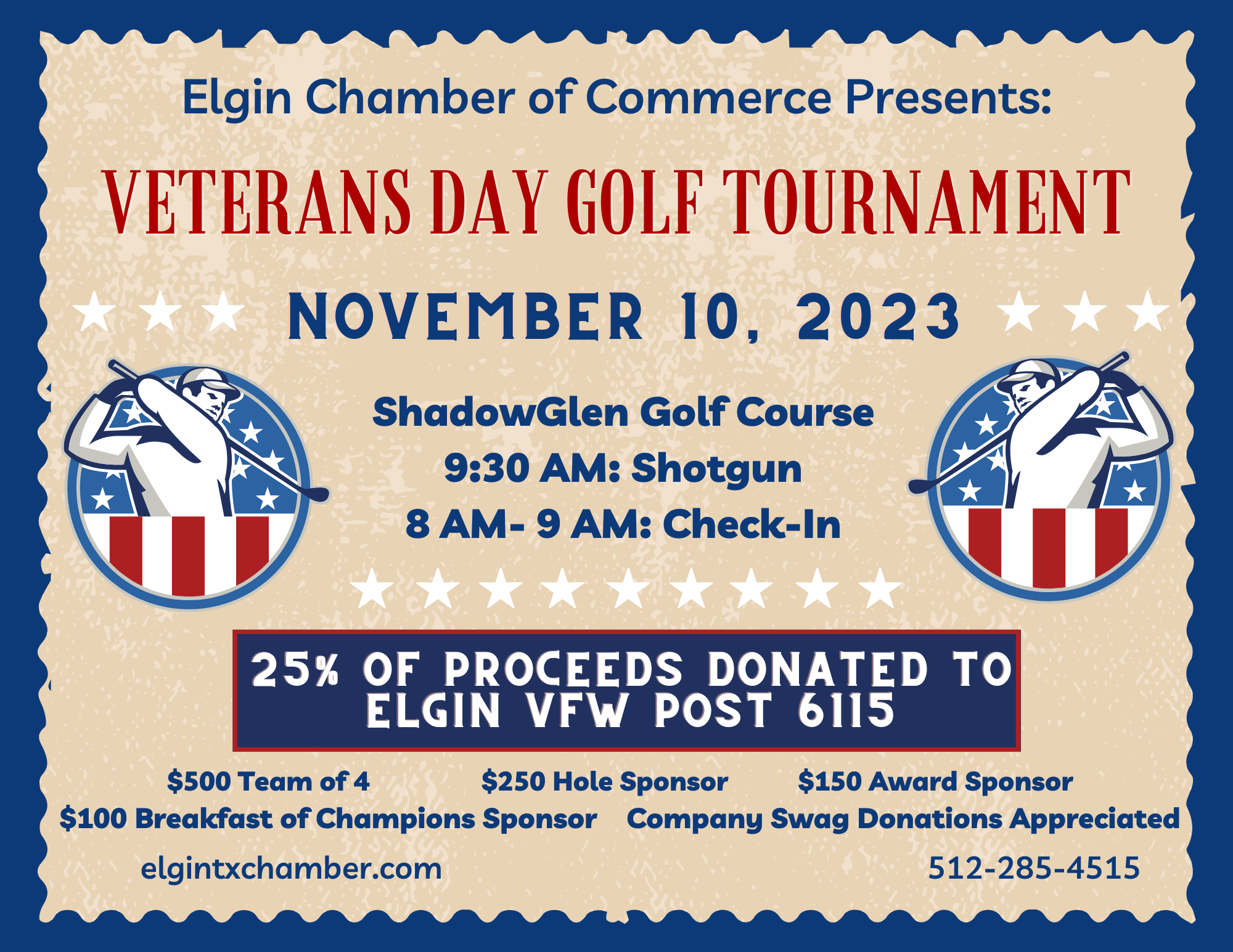 Join the Elgin Chamber of Commerce for it's first Veterans Day Golf Tournament. We will start your morning with Mimosas, Bloody Mary's and breakfast tacos. 9:30 AM shotgun with traditional tournament prizes for 1st Place, 2nd Place, Longest Drive, and Closest to the Hole. Want to up your chances for winnings, get in on the 50/50 Golf Gamble and participate in additional games along the way for cash pay outs. The more who purchase, the higher the pots. After the game, stick around for lunch, raffle prizes, and awards. 25% of proceeds will be donated to the Elgin VFW Post 6115.