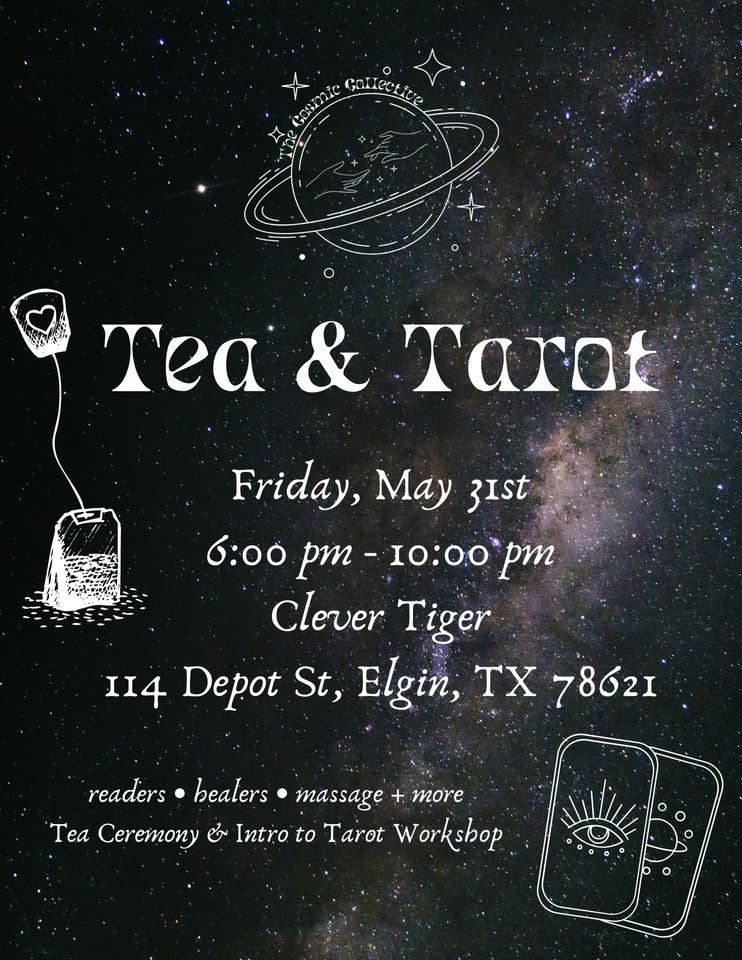 Come join us for our quartetly Tea & Tarot event, our biggest one yet! Get your weeked off to a steallar start with the Cosmic Collective, hosted by Sunnie Gonzales & Toré Sol. Our collective aims to promote holistic health and education on multiple levels and all dimensions. Building community and connection is a top priority so come socialize and get creative with Sunnie at the arts & crafts table. Come check out our amazing team of readers, healers, massage therapist, vendors and more. Stay awhile to enjoy our free Tea Ceremony and Tarot Talk Workshop. More to be announced soon! We are still accepting vendor applications until May 16th, if you're interested in participating as a vendor please fill out the form below. https://forms.gle/Uhq8t8Zqy7cJLN8d9 We look forward to you join us for this magical evening at the Clever Tiger! This is a FREE event, any donations made are greatly apprectiated but not necessary to attend. RSVP here - https://www.eventbrite.com/.../tea-tarot-tickets...