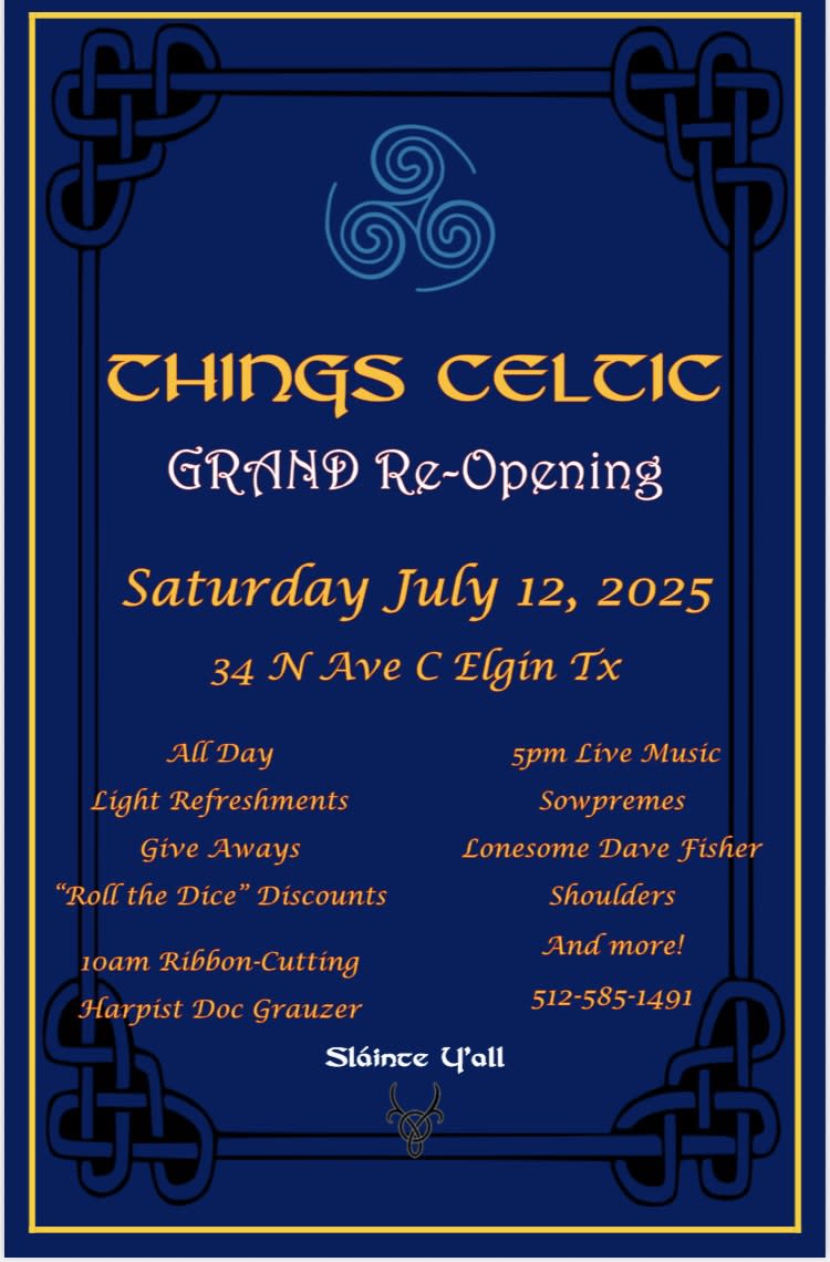 Come celebrate the Grand Reopening of Things Celtic in Elgin Texas. We will have live music, light, refreshments, discounts, giveaways, and other fun stuff.